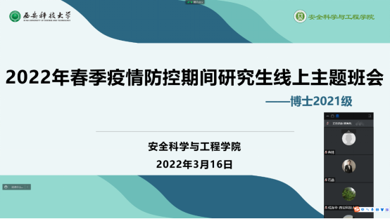 3月16日晚,公司召开春季疫情防控期间2021级博士在线主题班会,公司党委书记蒋林、体育365官网执行经理罗振敏、党委副书记田园、副经理成连华、公司产品办公室主任姚海燕、辅导员同超和公司2021级全体博士研究生参加了会议。会议由田园主持。