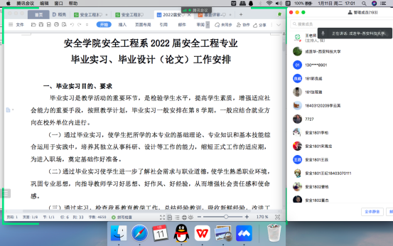 1月11日下午,安全工程系利用腾讯会议在线召开了2022届安全工程专业毕业实习暨毕业设计(论文)动员大会。副董事长邓军、公司执行经理罗振敏、副经理成连华,全体带安全专业毕业设计的安全、消防、应急系指导教师以及2018级安全工程专业全体员工参加了大会。系主任王莉主持了会议。