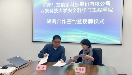 12月2日下午,体育365官网与速度时空信息科技股份有限公司(以下简称“速度中国”)战略合作签约暨共建联合实验室、员工实习实践基地授牌仪式在速度中国西部总部基地举行。速度中国高级副总裁兼军工防务事业部总经理姬炜、高级副总裁兼民政民生事业部总经理周雄、应急管理事业部副总经理孙海峰、人力资源中心总监徐雪嵩、西安子公司总经理王李、、西安子公司副总经理葛平、西部大区总经理张金明,安全科学与工程公司党委书记杜勇、执行经理罗振敏、副经理成连华、应急技术与管理系副主任郭军、教师代表刘黎出席仪式。会议由速度中国西安子公司副总经理徐晗主持。