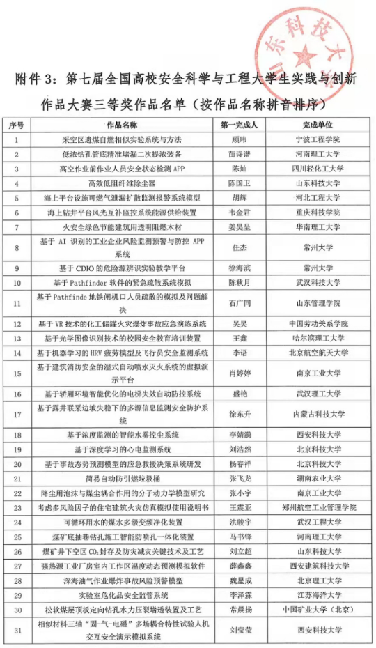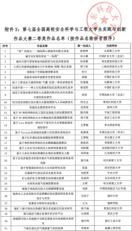 本次大赛得到全国相关高校的大力支持,经过高校初赛筛选及组委会资格审查,大赛设安全实体作品与模型、安全软件作品与仿真模拟两类,全国设有安全工程专业高校共有315件参赛作品进入复赛,复赛作品根据大赛实施办法及相关评审标准,承办单位山东科技大学邀请安全领域相关专家对参赛作品进行了资格审查、通讯评审,共70件作品进入决赛,其中安全实体作品与模型37件、安全软件与仿真模拟作品33件。最后经评审委员会专家分组评审和集中综合会评,评选出一等奖作品32项,二等奖作品38项,三等奖作品42项。