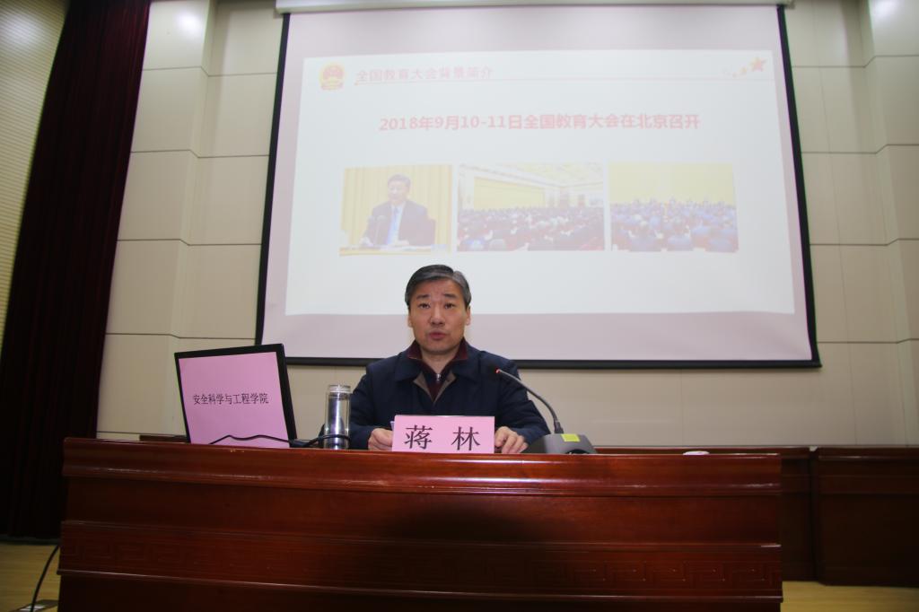 蒋林从深刻认识全国教育大会的背景与意义、全面领会习近平总书记关于教育工作的重要论述和认真落实全国教育大会精神,加强教师队伍建设三个方面就学习全国教育大会精神为广大教职工带来一场精神盛宴,对在各个岗位上为公司教育事业发展付出辛勤劳动的广大教师表示衷心感谢,同时向广大教师提出希望:希望广大教师深入学习和落实全国教育大会精神,牢记“教书育人”、“立德树人”的神圣使命,按照习近平总书记提出的“三个牢固树立”、“四个引路人”、“四个相统一”的要求,争做新时代“四有”好老师,发扬主人翁精神,秉承公司“励志图存,自强不息”的大学精神,深化体育365官网综合改革,发挥安全学科领头雁的作用,为把公司建设成为世界有影响、国内一流的特色鲜明的高水平教学研究型大学而不懈努力。