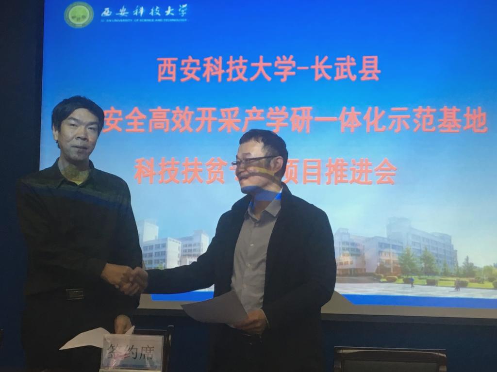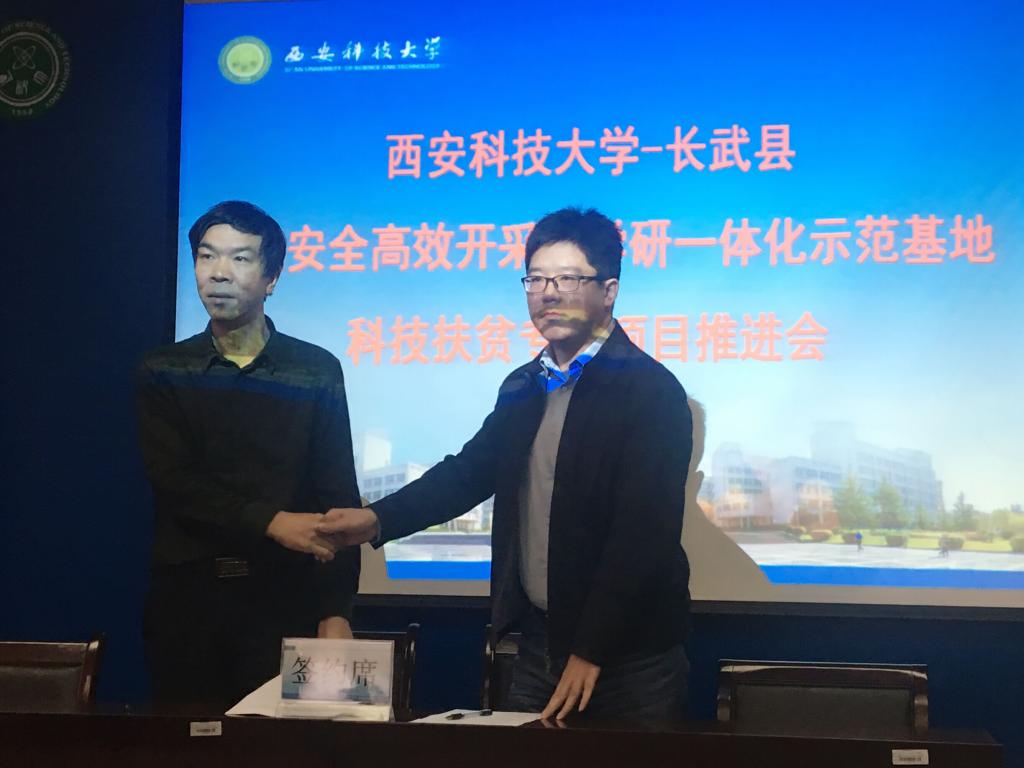 10月15日上午,在公司召开的长武县煤炭安全高效开采产学研一体化示范基地建设推进会上,体育365官网教师党支部院金永飞教授和张超教授分别与校科技处处长文虎教授签订了科技扶贫项目协议书。