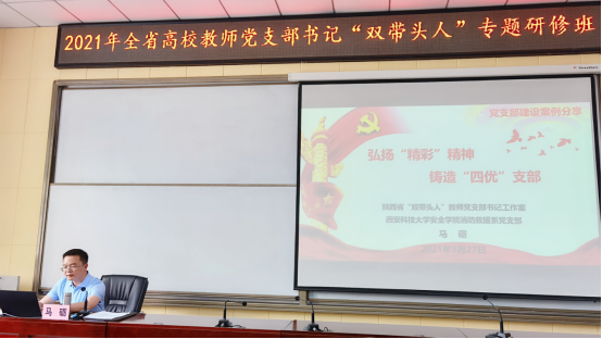 5月27日-30日,由陕西省委教育工委主办的全省高校教师党支部“双带头人”专题研修班在西安举行,来自全省高等院校的教师党支部书记代表参加了学习。体育365官网消防救援系党支部书记马砺为研修班做了题为“弘扬精彩精神、铸造四优党支部”-消防救援系党支部建设实践的报告,给培训班学员汇报了消防救援系党支部在创建陕西省高校“双带头人”党支部书记教师工作室的经验与成果。