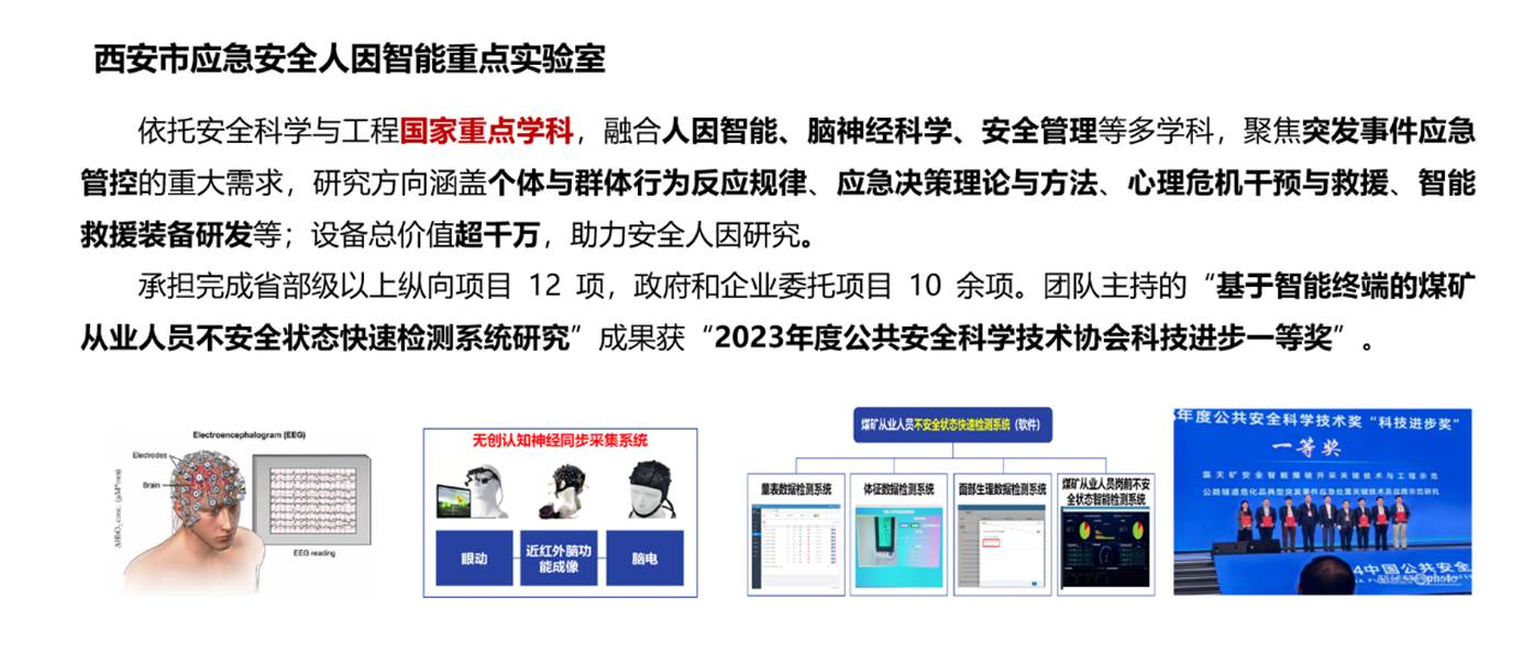 西安市应急安全人因智能重点实验室由365体育田水承教授、李红霞教授策划创建,并牵头组织365体育​体育365官网、管理公司与兵器部521研究所相关研究人员联合申报共建,2021年由西安市科技局评选公布。团队人才结构合理,汇聚了国家级高层次人才、海归优秀人才及一批中青年学术骨干,具备较强的科研创新与协同攻关能力。该重点实验室聚焦智慧城市与公共安全领域,依托安全科学与工程国家重点学科,构建了多学科交叉融合的研究平台(现有仪器设备总价值超3700万元,配备40余台/套先进设备,实验室总面积1900余平方米)。实验室围绕以下四大核心方向开展研究: