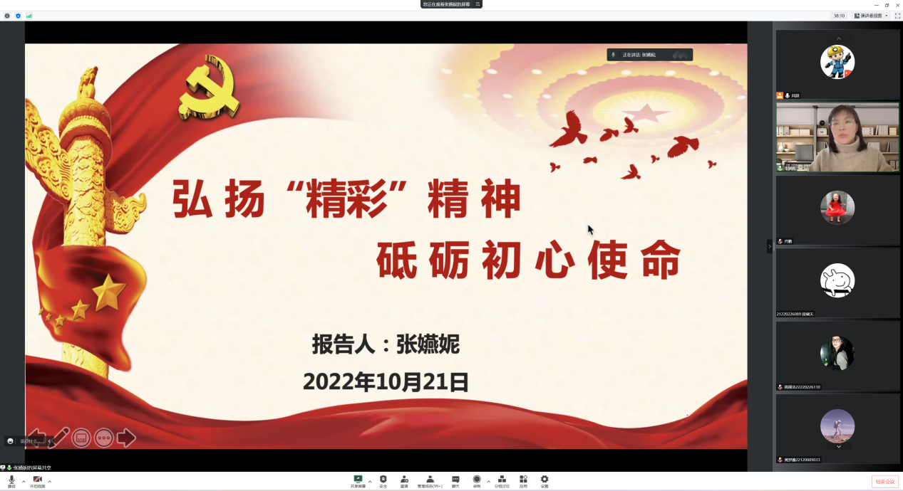 张嬿妮从“精彩”人生、“精彩”先进事迹、“精彩”精神传承三方面,详细讲述了徐精彩教授成长及工作经历,对徐教授学术贡献和社会贡献进行了梳理介绍,系统展示了传承精彩精神的内在需求和具体实践。并就“精彩精神”对目前研究生的现实指导意义进行了深刻解读,引发了全体师生的共鸣。
