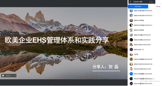 2022年11月26日晚,体育365官网安全工程系依托西部安全工程虚拟教研室,与公司安全协会联合举办“安全工程学术沙龙”第三期讲座。本次沙龙由安全工程系主任王莉主持。美光科技-美光半导体(西安)有限公司EHS高级工程师贺磊受邀就欧美企业EHS管理体系和实践,对体育365官网员工进行在线辅导。公司120余名本科生参与了本次沙龙。