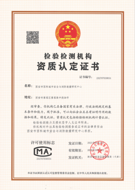 4月13日,公司获批国家检验检测机构资质认定证书(CMA)。这标志着公司成为陕西首家具有消防火灾类检验检测资质的高校,开创了公司检验检测及安全服务认证领域的新篇章,实现了教产学研高度融合的新突破,为服务国家安全、加快安全科学与工程团队建设再创新高。