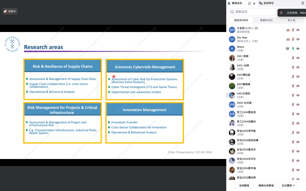 Wiens 教授以“欧洲的安全与风险管理:理论与技术前沿”为题,深入分析了欧洲在安全管理领域的理论实践,特别是风险管理技术的最新进展。他详细讲解了欧洲在应对突发公共安全事件中的风险评估方法及其前沿技术,分享了具体的实际应用案例。
