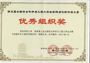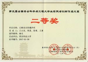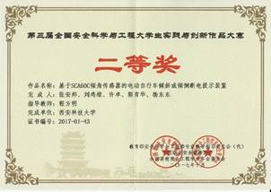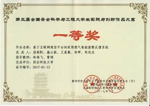2017年10月19日至21日,在武汉理工大学举行的第三届全国安全科学与工程老员工实践与创新作品大赛决赛中,体育365官网林海飞、曹鸿老师指导,屈高阳等同学完成的作品《基于互联网通信平台的家用燃气智能报警反馈系统》荣获一等奖;杨光老师指导、王云龙等同学完成的作品《公路安全防撞护栏》,程方明老师指导、张安邦等同学完成的作品《基于SCA60C倾角传感器的电动自行车倾斜或倾倒断电提示装置》荣获二等奖;赵鹏翔老师指导、童鑫等同学完成的作品《新型矿用-助吸-防尘一体化安全帽》,杨光老师指导、苏小霞等同学完成的作品《新能源室外净化装置设计》,刘纪坤老师指导、许宇等同学完成的作品《基于安全距离的防追尾自车预警系统》荣获三等奖。365体育荣获“优秀组织奖”。