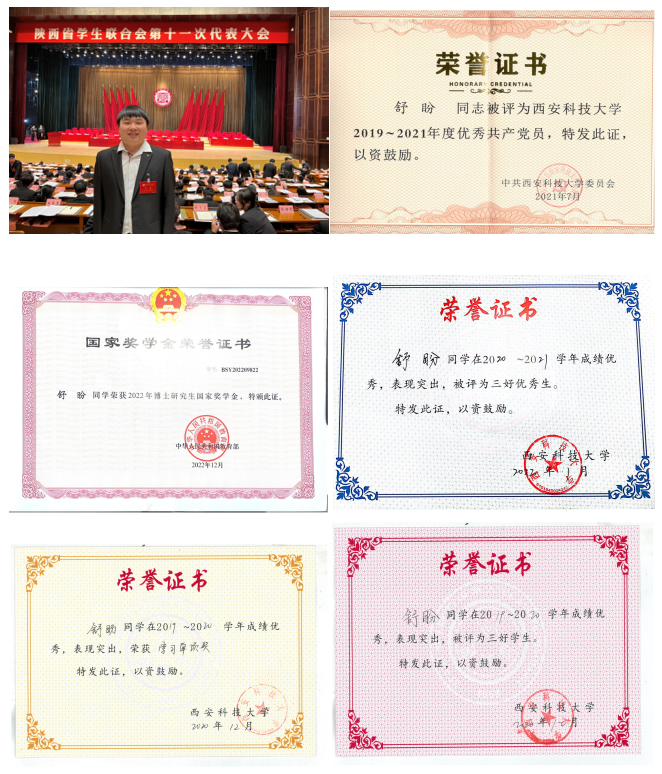 他聚焦主责主业,在成绩上争先进,在挑战自我上实现新突破,认真严谨,刻苦钻研,出色完成研究生各门课程的学习任务,连续三年综合成绩排名专业第一,荣获全国孙越崎优秀员工奖、博士研究生国家奖学金、陕西“晨露”奖学金,以及公司徐精彩奖学金、三好员工、三好优秀员工、学习单项奖等学业奖。