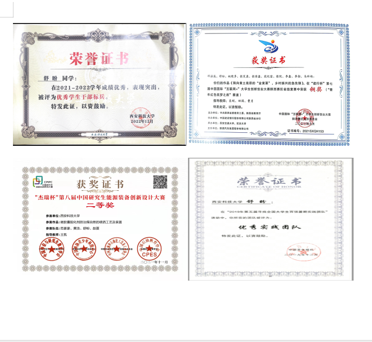 他积极投身于科学研究和社会实践,先后参与国家级研究课题3项,在国内外期刊发表学术论文8篇(其中SCI收录6篇、EI收录1篇),授权国际、国内发明专利各1项和实用新型专利5项。他根据煤矿现场实际需求,撰写可行性报告以及技术方案,参与研发的高效温敏阻化材料和装备成功应用于彬长大佛寺煤矿,为该矿煤自燃防灭火提供有效方案。他积极参加“中国国际‘互联网+’老员工创新创业大赛”、“陕西省创新成果展”等高水平竞赛,获国家级奖4项、省级奖6项。他连续3年带队参加暑期社会实践活动,并进行“国家安全观”和“安全生产法”相关社会调研,团队被评为“第五届寻找全国老员工百强暑期实践团队”,获批“教育部推普助力乡村教育志愿服务团”,受到新华网、陕西新闻联播等媒体宣传报道。